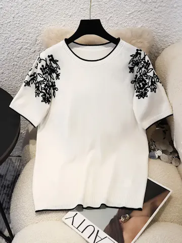 Women’s black and white casual short-sleeve T-shirt featuring a round neck and embroidered geometric floral design. Medium-stretch fabric offers comfort and versatility, making it an all-season wardrobe staple for effortless style.